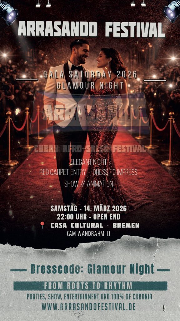 Am Samstag heißen wir Euch auf der Arrasando Gala Glamour Night willkommen. Einer Nacht, in der Glamour auf Salsa, Timba und Son Cubano trifft, in der jeder Schritt strahlt und jeder Blick eine Geschichte erzählt.